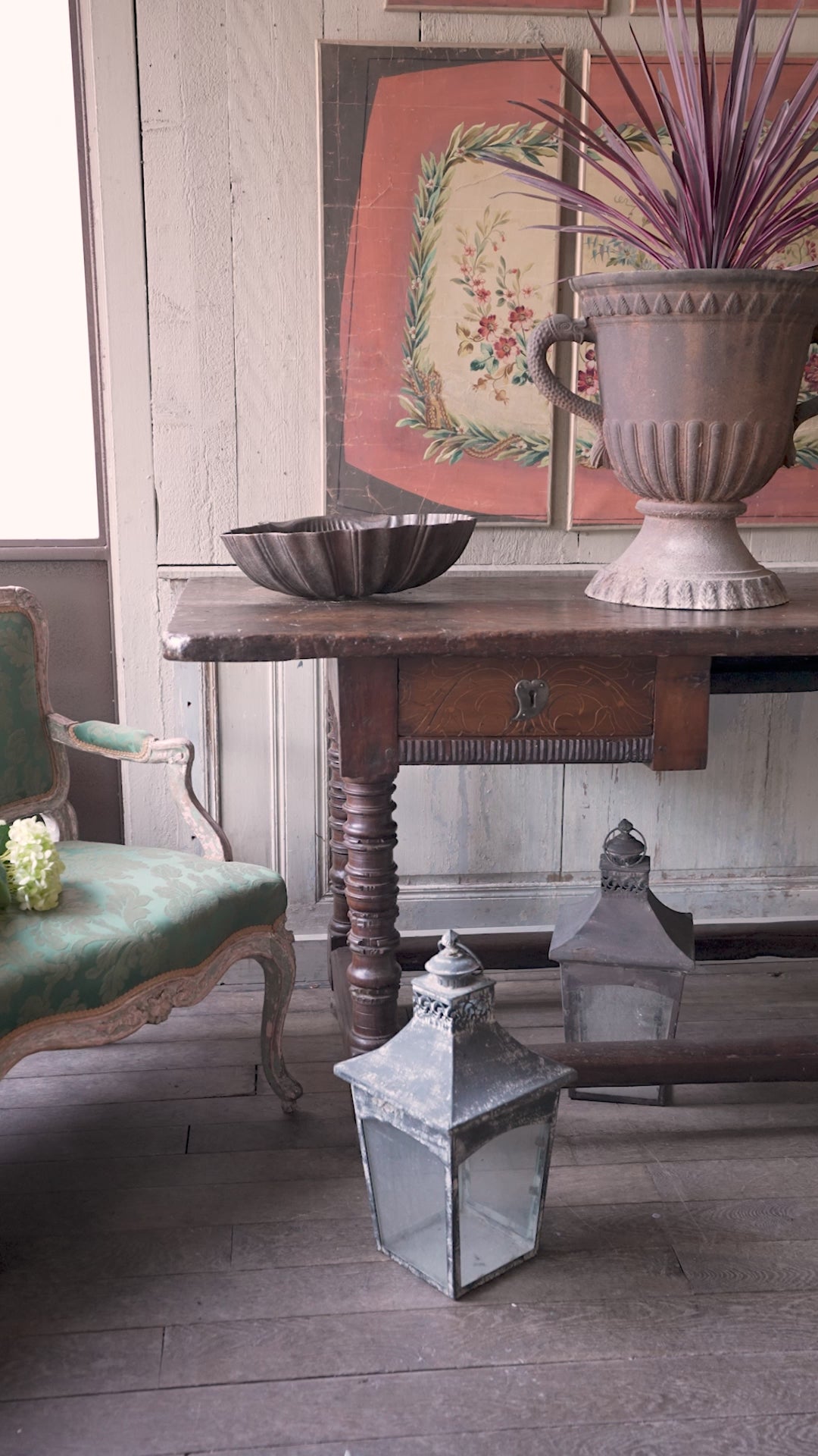 In a contemporary space, this table can be used as a striking side table or console in a dining room, office, or grand entryway, harmonizing beautifully with both traditional and modern interiors. Pair it with antique or leather-upholstered chairs for a timeless aesthetic, or contrast its aged wood with sleek metal or glass décor elements for a striking visual mix. Its deep patina and marquetry detailing make it an elegant focal point that adds character and history to any setting.