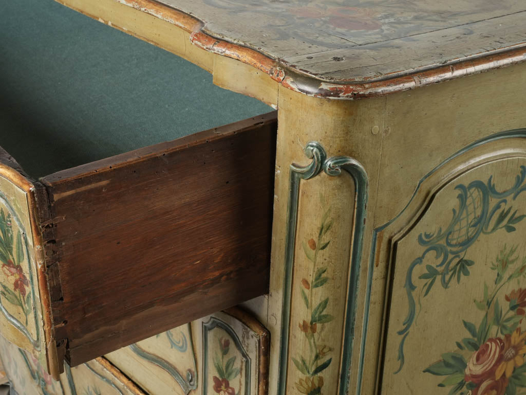 This exquisite 18th-century French commode is a stunning example of classic French design, enhanced by a later Italian-style painted finish applied in the 19th century. Its elegant serpentine shape and delicately curved drawers evoke the grace of ribbon-like folds, while the scalloped apron with a central shell motif pays homage to the refined ornamentation of the Louis XV period. Resting on scrolled feet with ornate sabots, this piece exudes both sophistication and timeless charm.