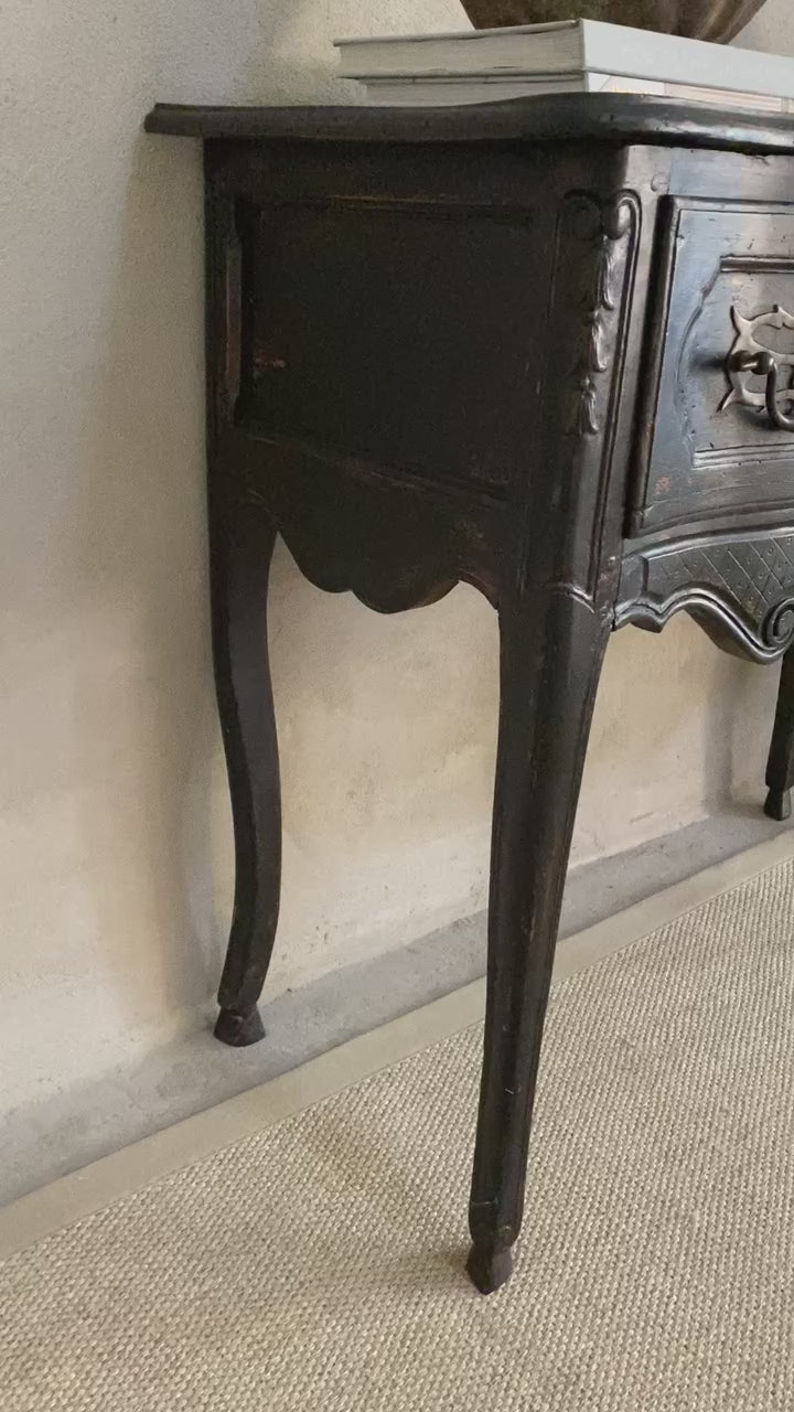 Dating from the eighteenth-century, this single drawer arbalete commode was most likely used for storing wigs. Made from walnut with a black paint finish. Original hardware. This would look superb in a hallway or entryway. It can be used as a console.