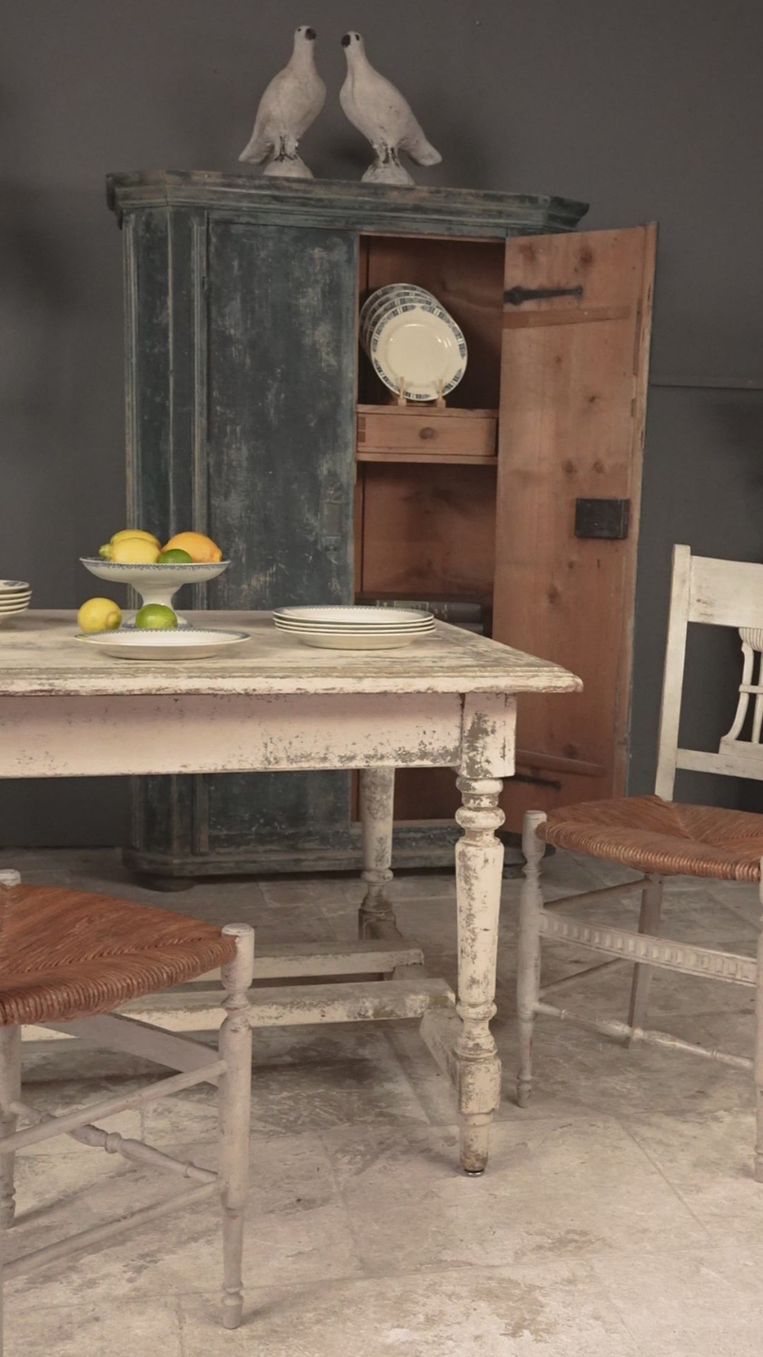 The surface shows the wear and marks of time, giving it a warm, authentic character. The table stands on six turned legs with classic detailing, connected by simple stretchers for added stability and strength, a practical feature typical of draper’s tables. The distressed white paint has a timeworn charm, with areas of chipping and patina that lend it a relaxed, rustic appeal.