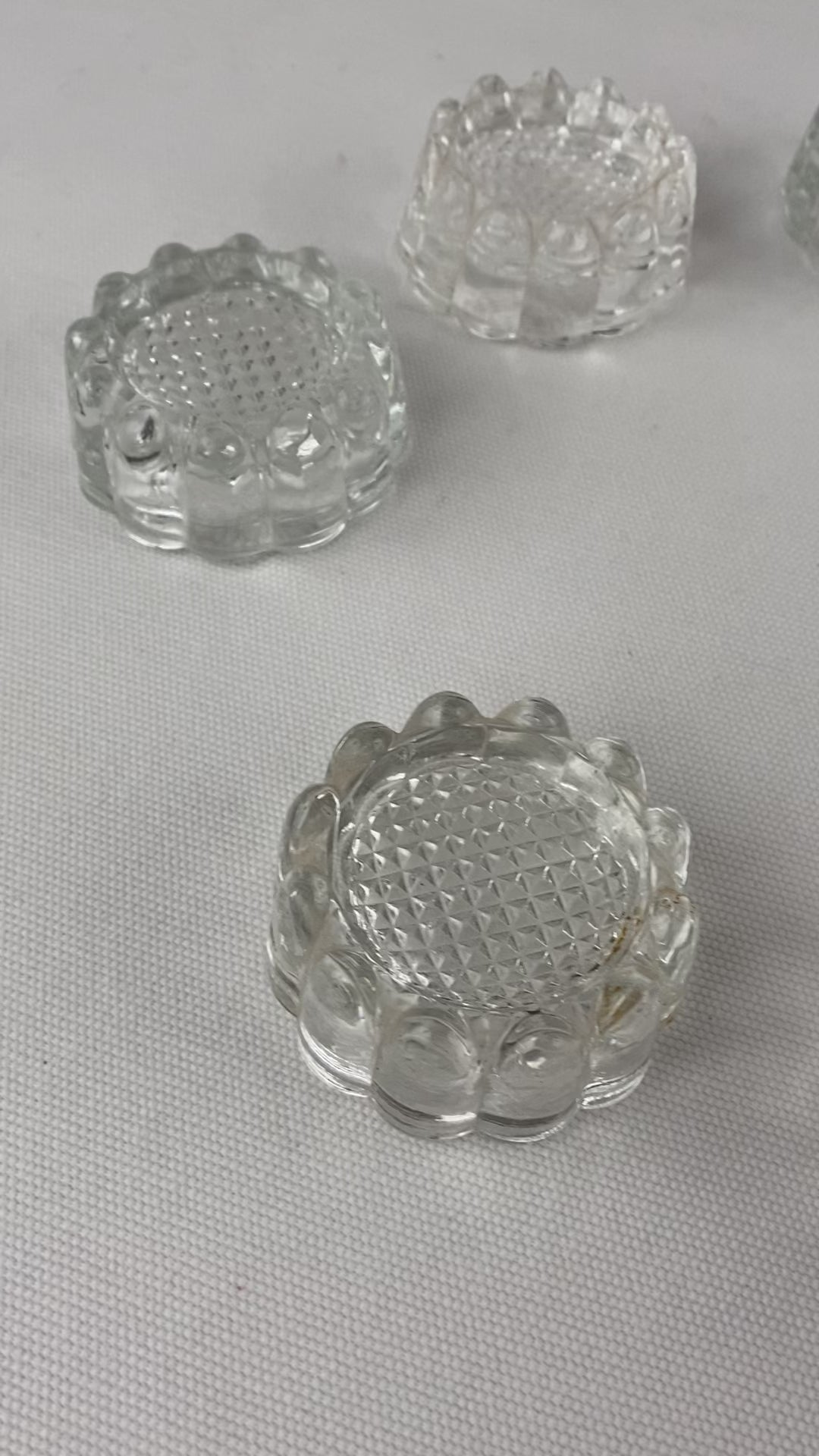 A set of eight modern glass table risers. Perfect for adding height to a table and protecting the feet from wet mops during cleaning.