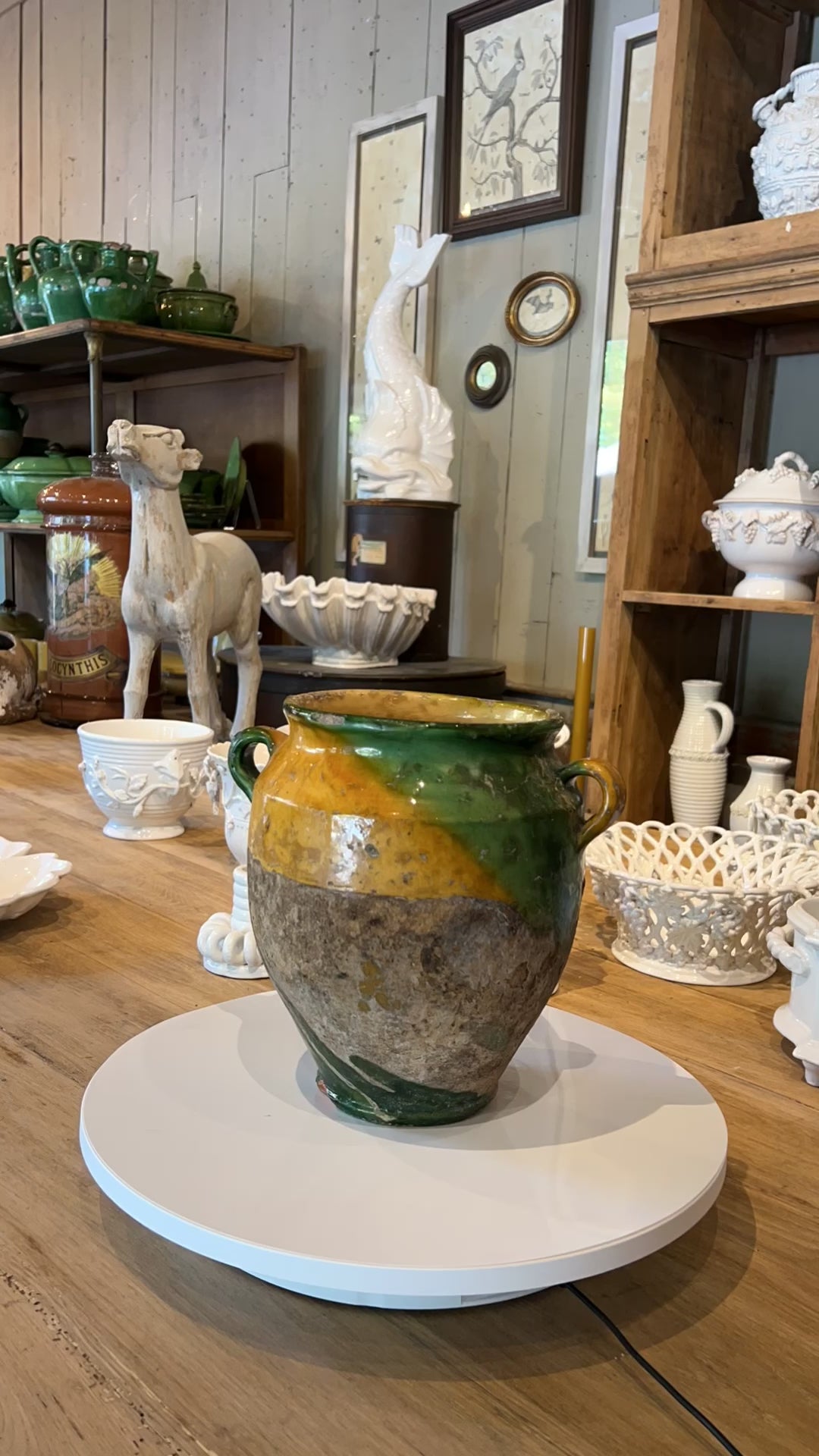 A gorgeous French confit pot from the nineteenth-century. The yellow and green glaze has been applied diagonally, which is rather unusual. A lovely piece to display in a collection of antique French pottery.