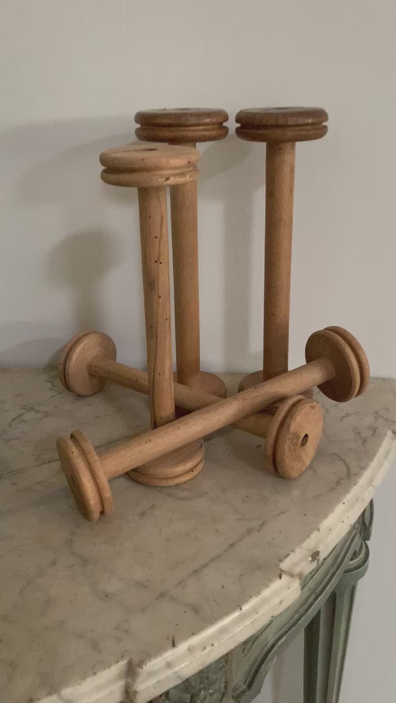 A collection of five antique bobbins from the early / mid twentieth-century. Made from wood and branded. These will make a lovely decorative accent.