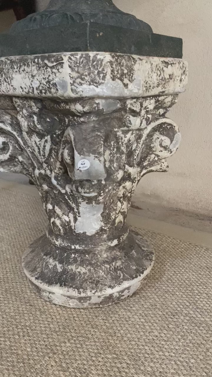 An early-twentieth-century ceramic pedestal in the shape of a Corinthian column capital. The superb patina recently has been applied. This would be a wonderful display stand for a sculpture or cast-iron Medici urn.