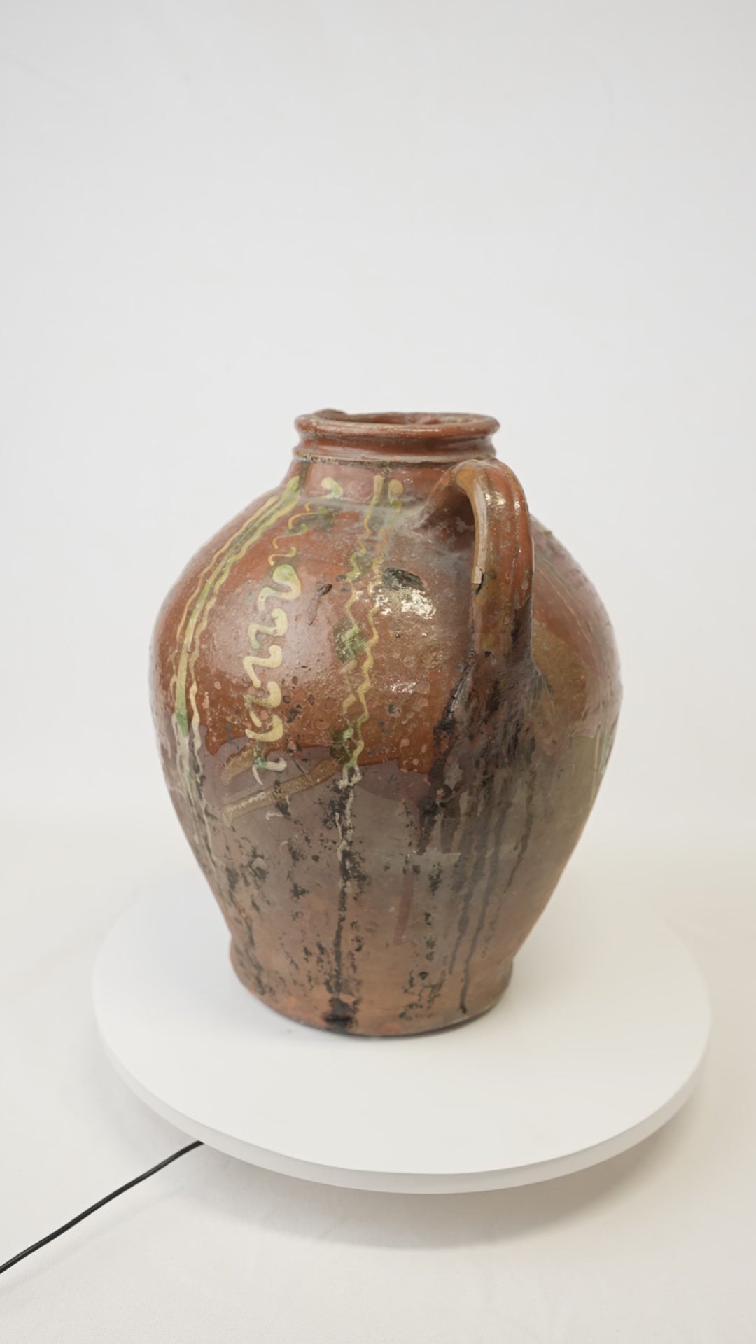 This large painted jug from the southwest of France dates to the 19th century and features a robust, rounded form with a rich glaze in warm earthy tones. The surface is adorned with hand-applied decorative motifs in ochre and white, evoking natural elements. The presence of both a handle and a pouring spout suggests it was used for storing and serving liquids, likely water given its size. Its timeworn patina, with areas of wear and chipping, adds to its authentic charm.