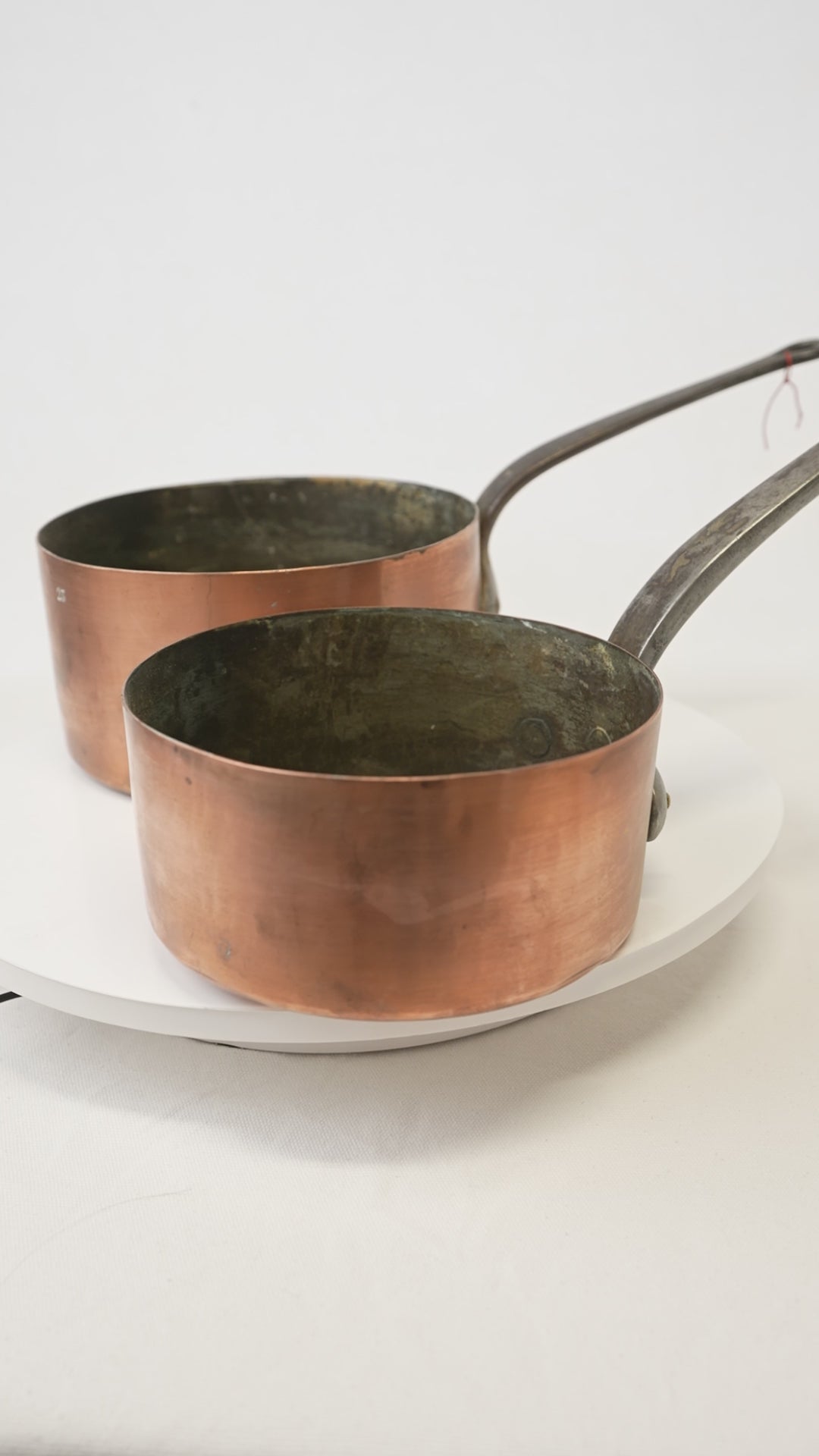 This set of two antique copper saucepans features sturdy riveted iron handles and a beautifully timeworn patina. The interiors are not tinned, or the tinning is severely worn, making them unsuitable for cooking but ideal for decorative use. The warm tones of the aged copper contrast with the darkened iron handles, adding to their rustic charm.
