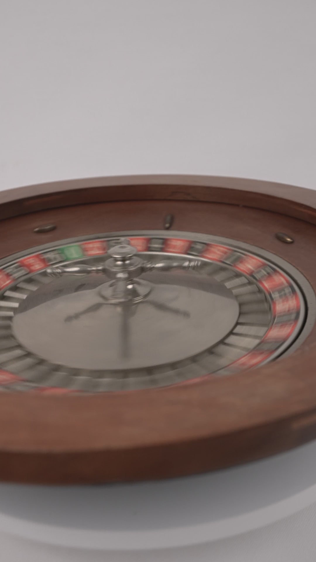 This mid 20th century roulette top features a functional four-handled wooden wheel that spins smoothly. The top includes the iconic black and red numbered slots, typical of traditional roulette tables. Its practical design and operational condition make it a solid representation of casino gaming from the era. This piece is well-suited for those interested in vintage casino memorabilia.